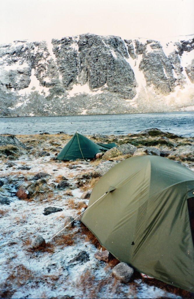 Myself, A. Mackervoy and R. Woolison walked in up Glen Derry from the roadhead at Linn of Dee to Loch Etchachan. It is an attractive wilderness, the route follows a rough road hike up-valley through Scots Fir enclosures before ending. The valley floor is a dried-up ribbon lake. We stopped for a bite to eat at the Hutchinson Bothy and pushed on. We met two lads who said it was windy up in the corrie of Loch Etchachan. We got up into the corrie as the light faded. It was windy: the hard wind and the fading light made pitching our camp difficult. We were pitched into frosted grass and light snow. In the night it rained a lot.
