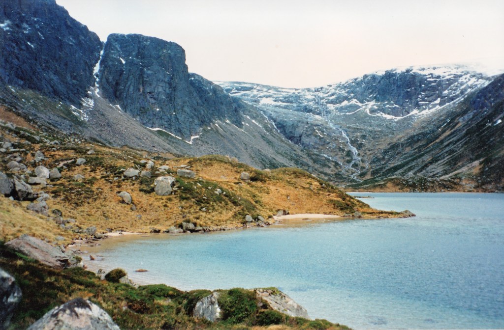 On which we had an easy start climbing through sunlight through fresh snow onto untouched summits, then a grand walk along the tops through a brutal wind. Down to the wild and remote Loch Avon, which had pretty sandy beaches. Better camping ground here than at Loch Etchachan, had we but known. We visited the Shelter Stone, and then, up a steep side through heavy snow, past frozen cliffs and waterfalls – beautiful scenes – up to Coire Etchachan and our tents.